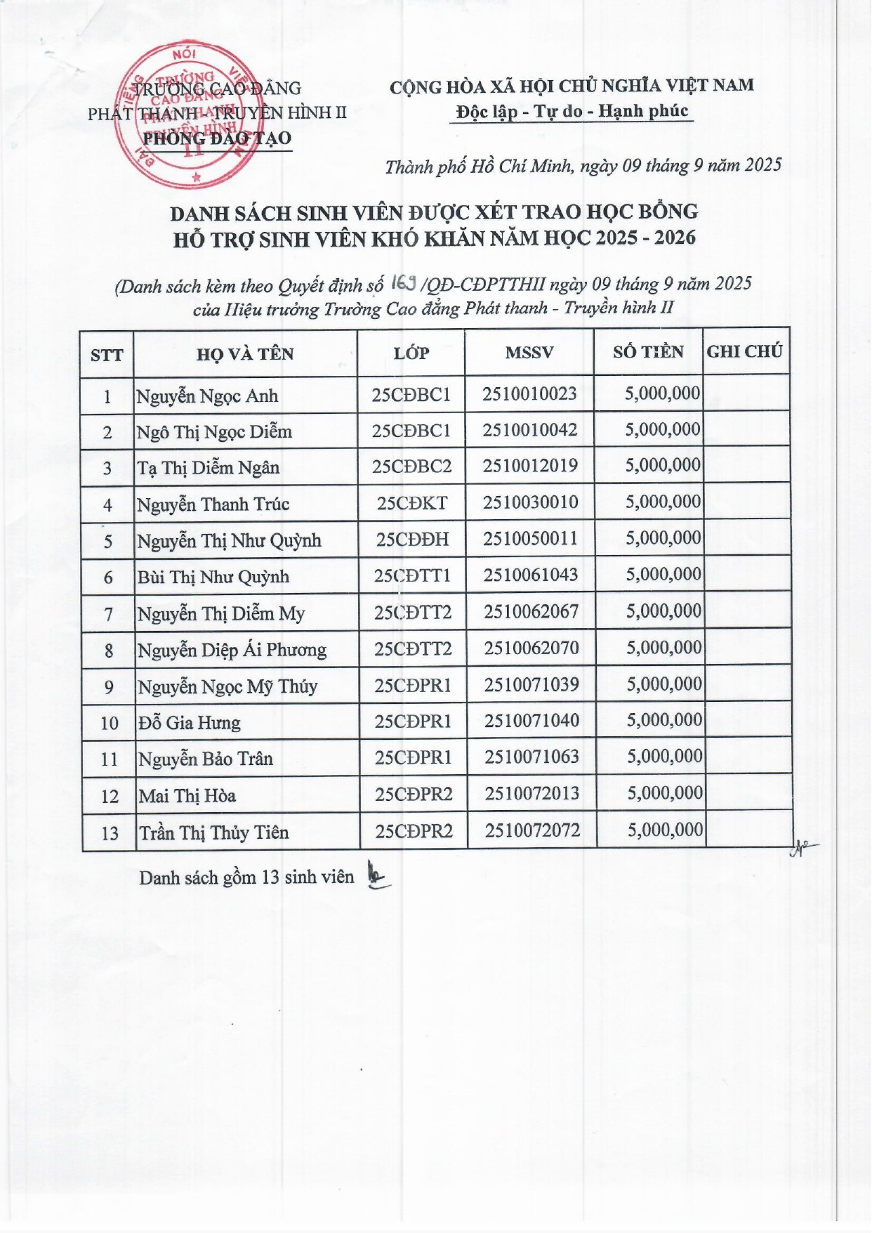Quyết định về việc trao học bổng "Hỗ trợ sinh viên khó khăn" năm học 2025-2026