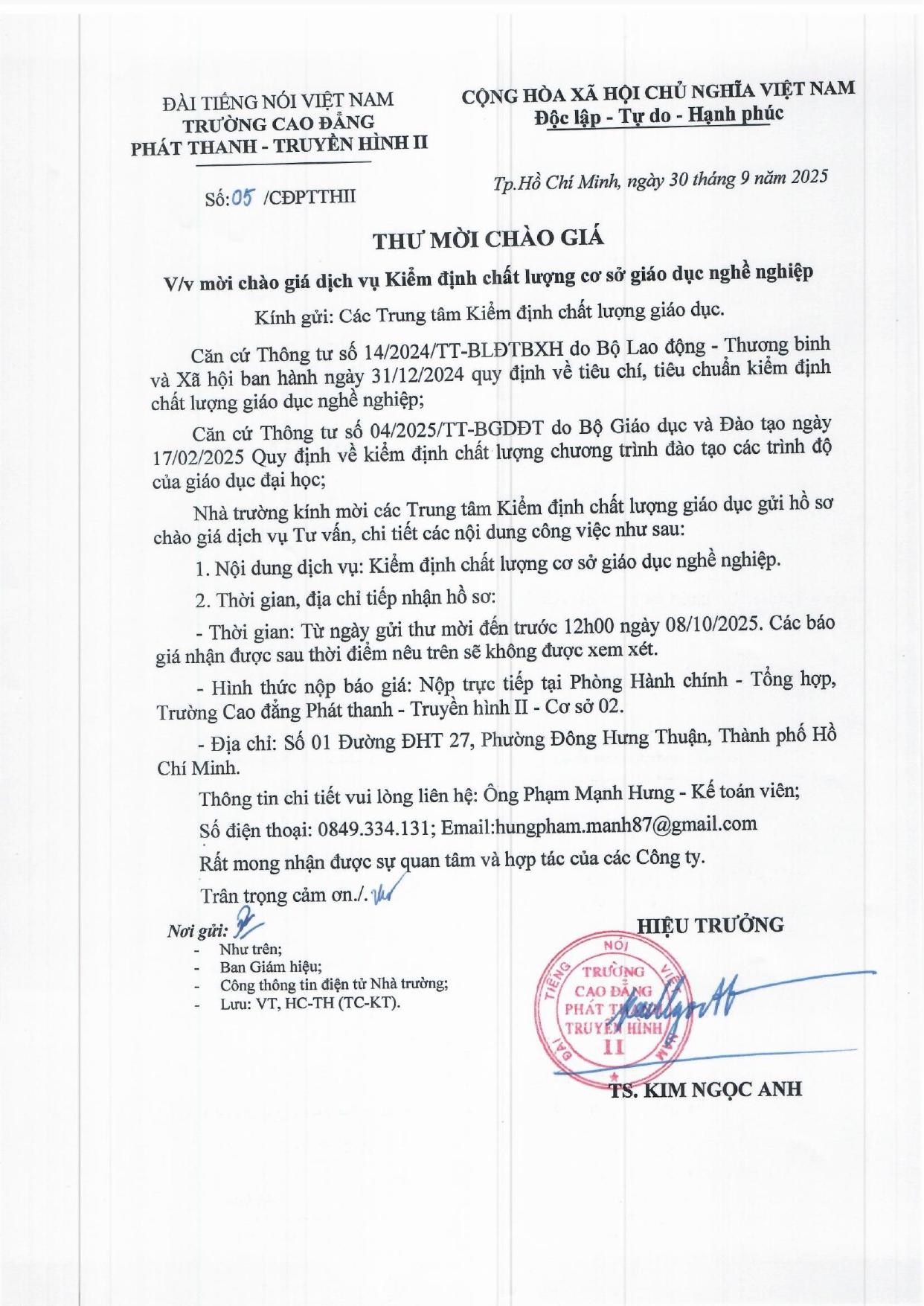 - Thư mòi chào giá về việc mời chào giá dich vụ Tập huấn tự đánh giá và Kiểm định chất lượng cơ sở giáo dục nghề nghiệp (Tải về)